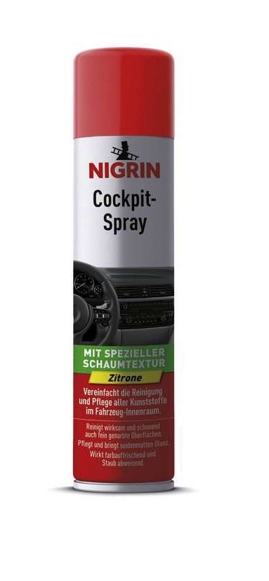 Kvalitní cockpit sprej od německé firmy Nigrin pro dokonalé čištění a ošetřování všech typů plastových materiálů v interiéru vozidla. Pěnový přípravek s příjemnou vůní čistí a obnovuje povrchy a vytváří na plastu voděodolný, polomatný, antistatický ochranný film, který usnadňuje opakovanou údržbu povrchu.