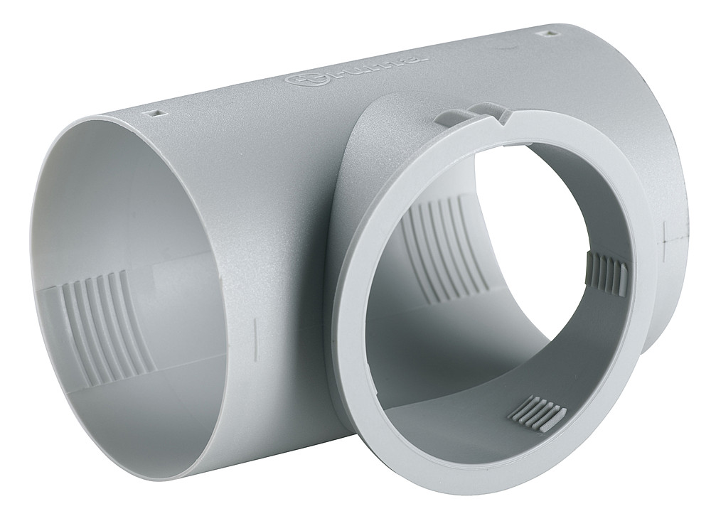T/LT-spojka pro trubky rozvodu teplého vzduchu, průměr vnitřní 65, vnější 72 mm. Pro větvení nebo stěnové ukončení. Barva šedá.