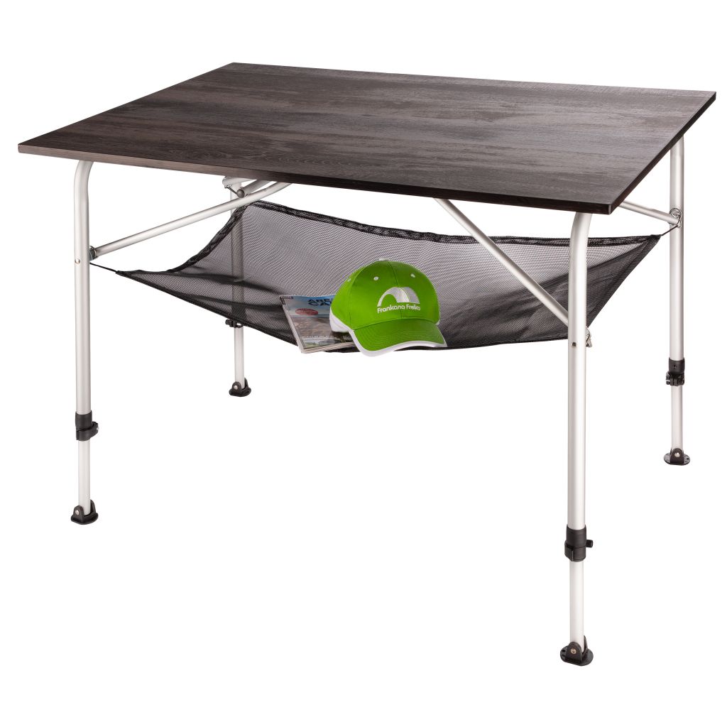 Klasický kempinkový skládací stolek s pevnou deskou, odolnou proti povětrnostním vlivům. Všechny čtyři nohy jsou plynule výškově nastavitelné v rozsahu od 59 do 72 cm. Součástí stolu je odkládací síťka a kotvicí kolíky.