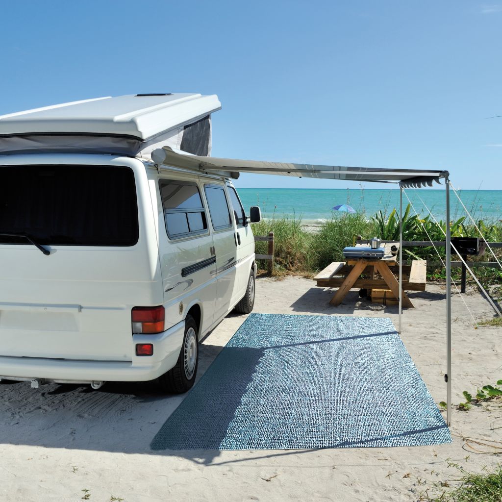 Vysoce kvalitní venkovní koberec s PVC pěnovou vrstvou o tloušťce cca 4 mm. Prodyšný, příjemný na chůzi, snadno se čistí. K dispozici v modré, zelené a šedé barvě. Dodává se včetně úložné tašky.