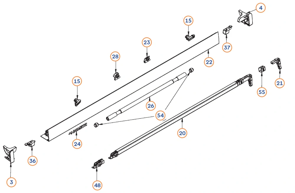 Plastový koncový kryt výsuvného panelu markýzy Dometic PW1100 bílá, levá strana. Pozice 3 na obrázku.