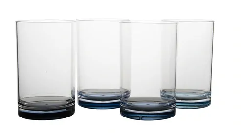 Sada 4 ks kvalitních sklenic z odolného čirého plastu SAN (Styrol-Acrylnitril) s modře probarvenými dny. Objem 320 ml.